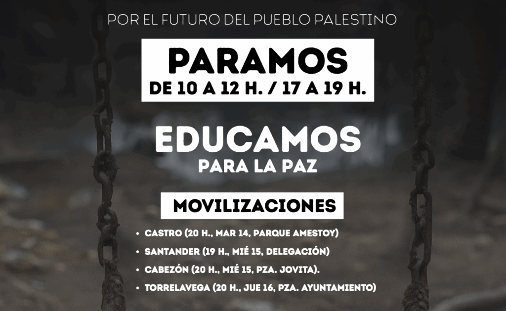 En el caso de la Educación de Cantabria, coincidiendo con el Miércoles Verde, hay convocados paros de 10 a 12 h. (horario de mañana) y de 17 a 19 h. (horario de tarde). También os animamos a aprovechar la jornada para hablar de la situación de Palestina, realizar actividades relacionadas, guardar un minuto de silencio, compartirnos fotos del claustro…