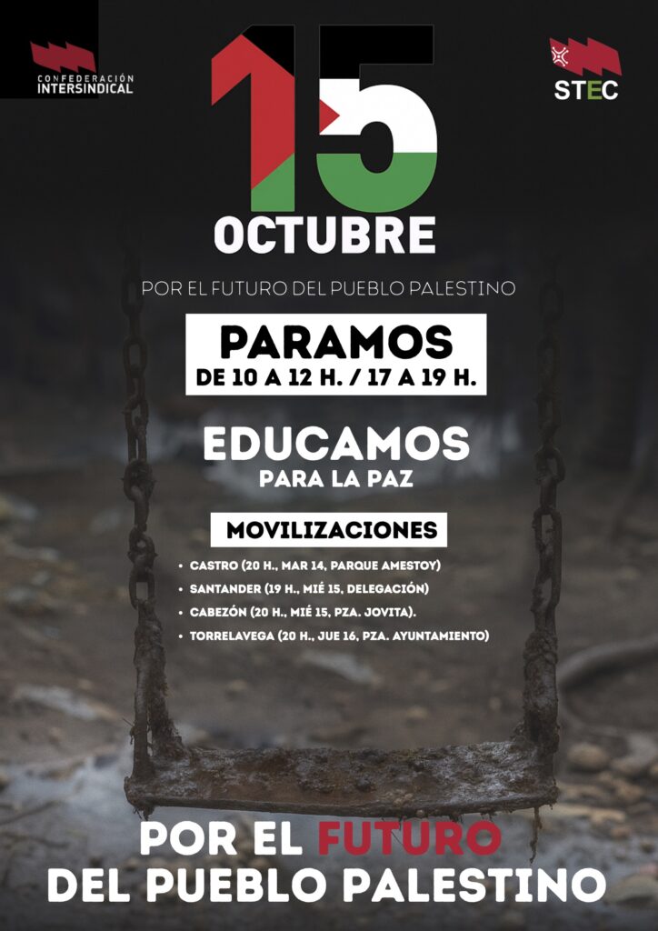 La mayoría de la Junta de Personal Docente de Cantabria (STEC, CCOO, UGT) ha acordado informar al profesorado que trabaja en los centros educativos públicos de que el próximo miércoles 15 de octubre hay una jornada de movilización en solidaridad con Palestina, para reclamar un plan de paz permanente, corredores seguros de ayuda humanitaria, la suspensión y revisión del acuerdo de asociación UE-Israel, la prohibición del comercio de armas con el estado sionista, la condena institucional de la política genocida que sufre el pueblo palestino y la puesta en marcha de planes de cooperación urgentes.