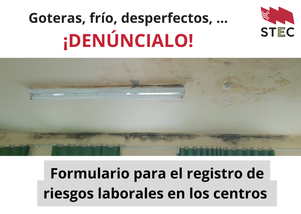 Ahora que han llegado el frío y las lluvias, el deterioro de algunos de nuestros centros de trabajo se hace más notorio. Desde el área de Salud Laboral de STEC ponemos en marcha una campaña para la recogida y denuncia de todos los casos detectados de incumplimiento de la normativa de Prevención de Riesgos Laborales en la red de centros educativos públicos de Cantabria.