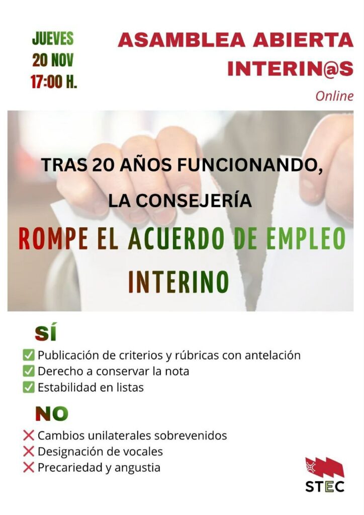 Vivimos tiempos cruciales en la defensa de unas oposiciones justas y la estabilidad en las listas del colectivo interino. Tenemos que volver a defender un sistema que lleva 20 años siendo envidiado por las demás CCAA y el camino es claro: asamblea el jueves y movilización el lunes 24N. Tenemos que estar.