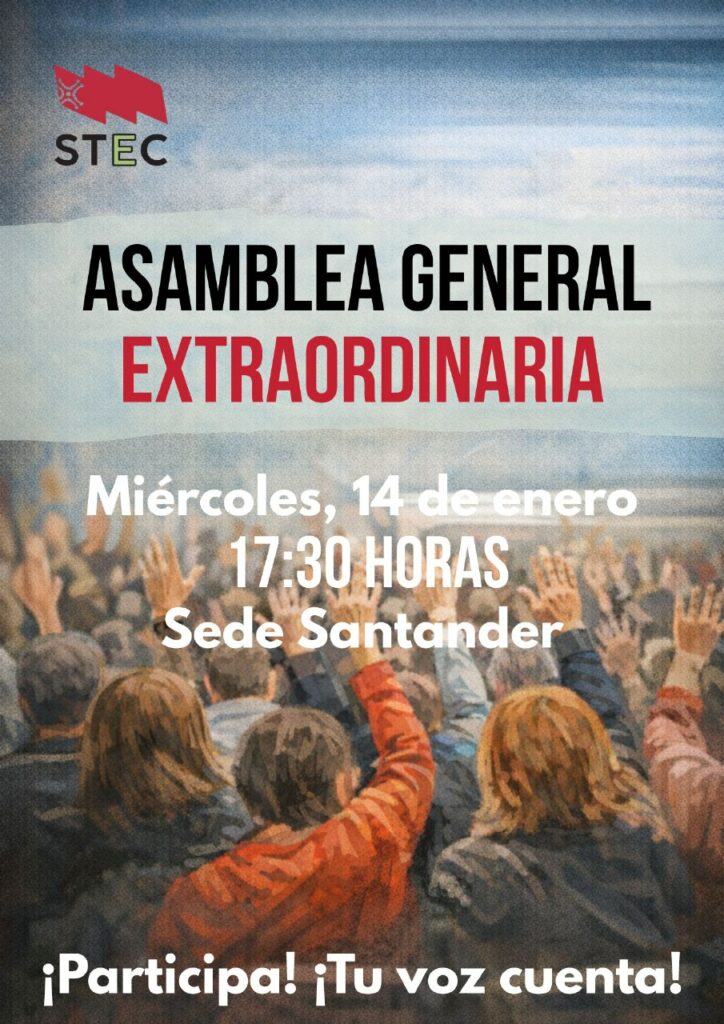 La afiliación del STEC habéis recibido en el correo la convocatoria de la asamblea general extraordinaria, que será el próximo miércoles 14 de enero, a las 17:30 h., en la sede de Santander, con opción telemática (enlace en el correo).