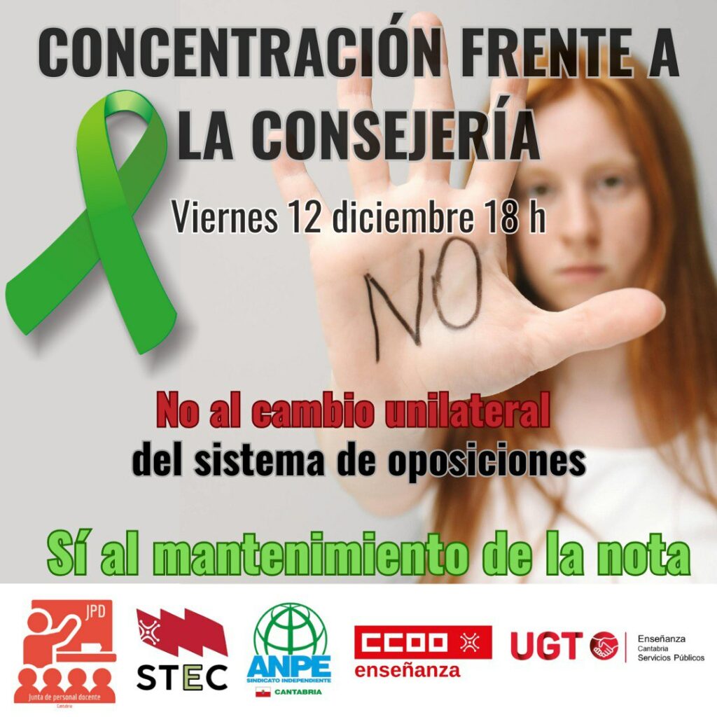 Ante este escenario y ante los atropellos que suponen la eliminación de la conservación de la nota y el cambio unilateral del modelo de gestión de las oposiciones, la Junta de Personal Docente de Cantabria convoca una concentración el viernes 12 de diciembre a las 18 h frente a la Consejería de Educación en la santanderina calle Río de Pila para exigir que no se impongan nuevas medidas sin negociación y para defender un modelo de oposiciones justo, estable y transparente.
