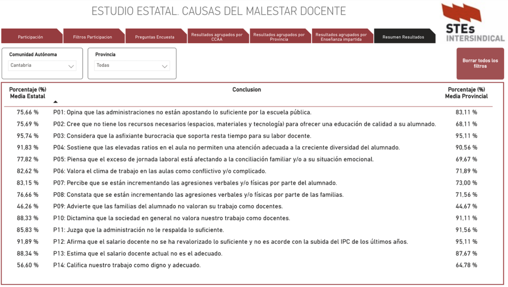 En la misma línea de este estudio, la Confederación de STEs ha publicado esta semana resultados de una macroencuesta estatal sobre las causas del malestar docente en la enseñanza pública no universitaria. En ella, el 95% del profesorado de Cantabria considera la sobrecarga burocrática asfixiante y perjudicial para su labor, cifra similar a la media estatal. Además, es el problema que más consenso ha creado entre los docentes, superando incluso al de la bajada de ratios.