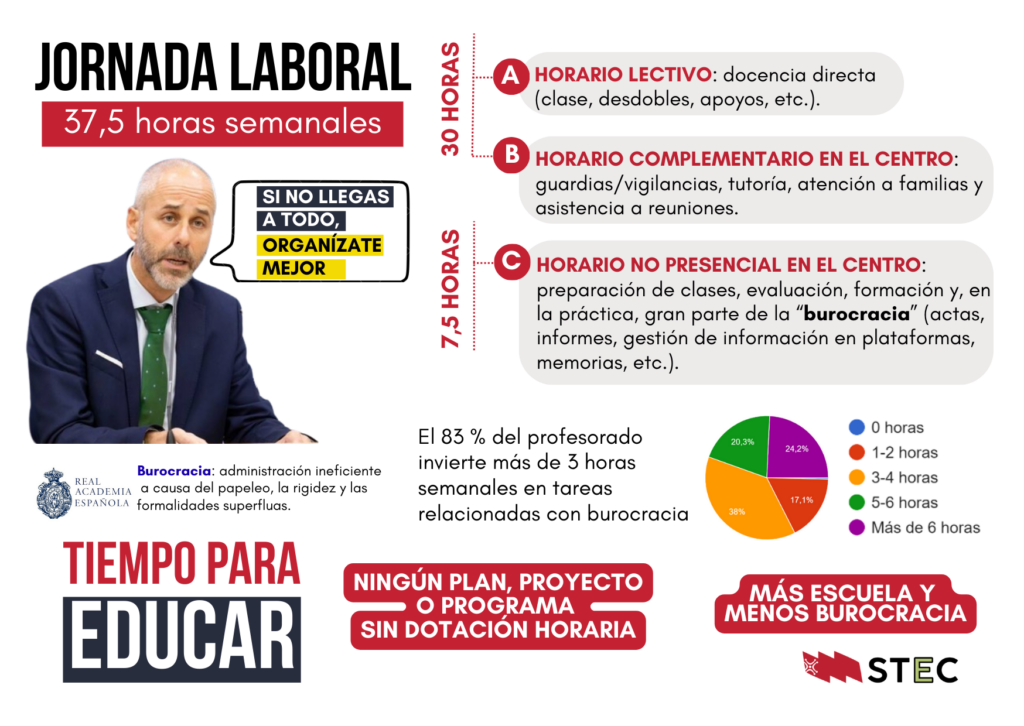 El horario del profesorado está comprendido por 37,5 horas, de las que 7,5 horas se destinan a la preparación de actividades docentes, formación permanente o cualquier otra actividad pedagógica complementaria. Sin embargo, el estudio realizado por STEC sobre la carga burocrática concluye que el 83% del profesorado destina 3 o más horas semanales a cuestiones burocráticas, lo que reduce a la mitad el tiempo que el profesorado puede destinar a la preparación de clases.